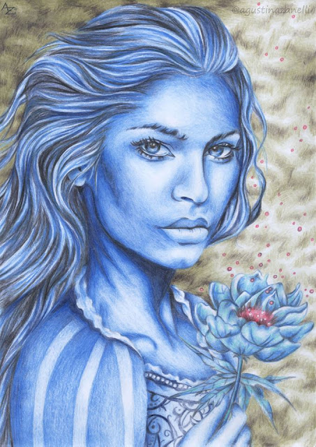 Hice a los tres protagonistas del libro basándome en las descripciones de la autora (siendo que aún no leí el libro). Es por eso que preferí usar una misma tonalidad, porque aún no conozco detalles como color de ojos y esas cosas. Además que me gustaba cómo quedaba el color azul asociado al mar.